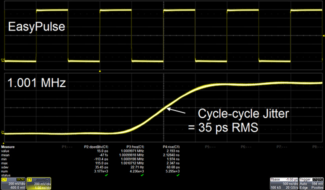 DDS方法输出方波/脉冲时, 如果采样率和输出频率不成整数倍关系,将产生一个采样周期的抖动。采用EasyPulse技术可克服这个缺陷;产生低抖动的方波和脉冲信号,此外还具有以下优势: